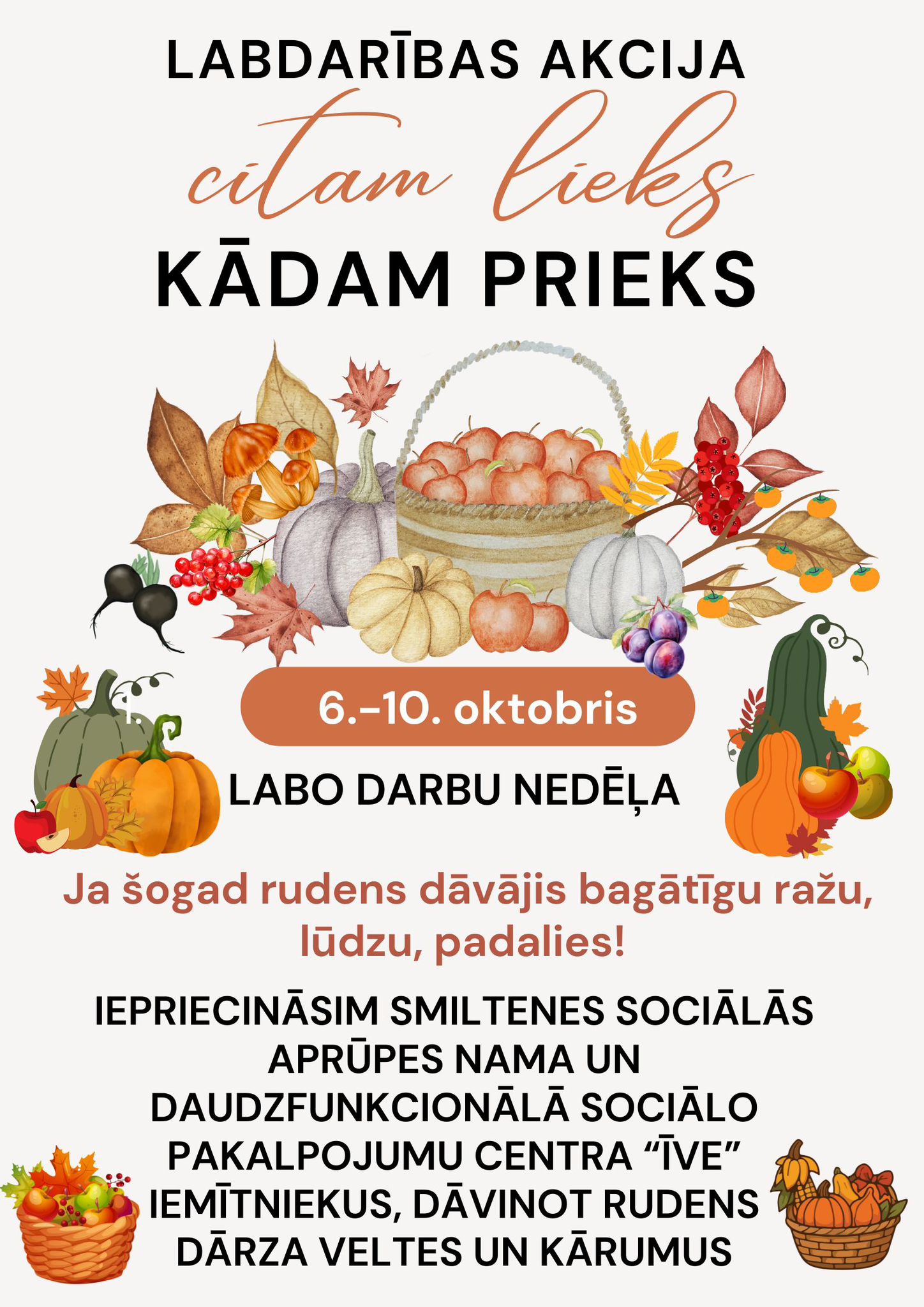 Aicinām “Labo darbu nedēļā” iepriecināt mūsu draugus daudzfunkcionālajā sociālo pakalpojumu centrā “Īve” un Sarkanā Krusta Smiltenes slimnīcas sociālās aprūpes un sociālās reha..