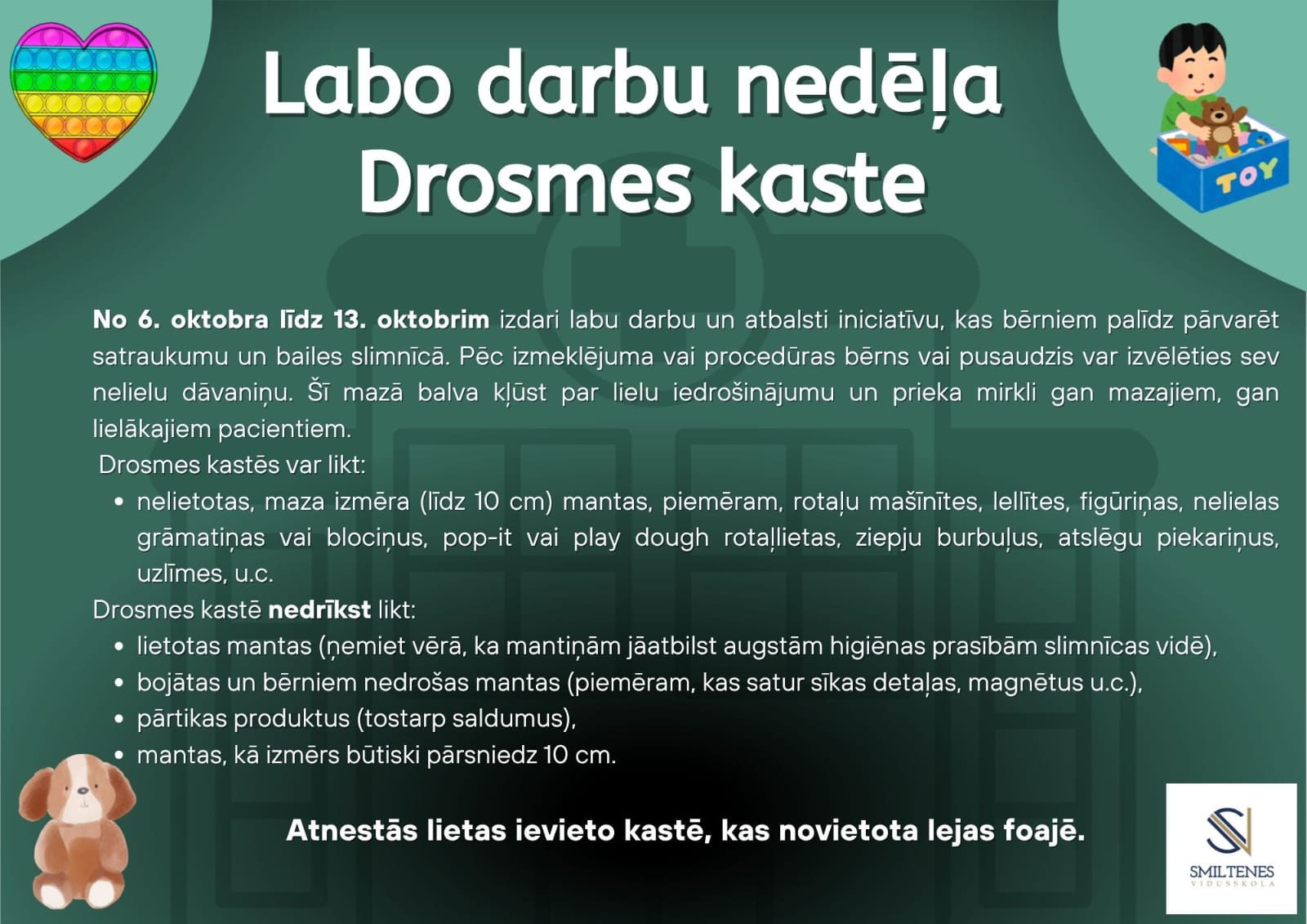 Smiltenes vidusskola aicina sākumskolēnus un viņu skolotājus Labo darbu nedēļā atbalstīt Vidzemes slimnīcas mazos pacientus, piedaloties akcijā “Piepildīsim drosmes kasti!” Visiem, kuri vē..