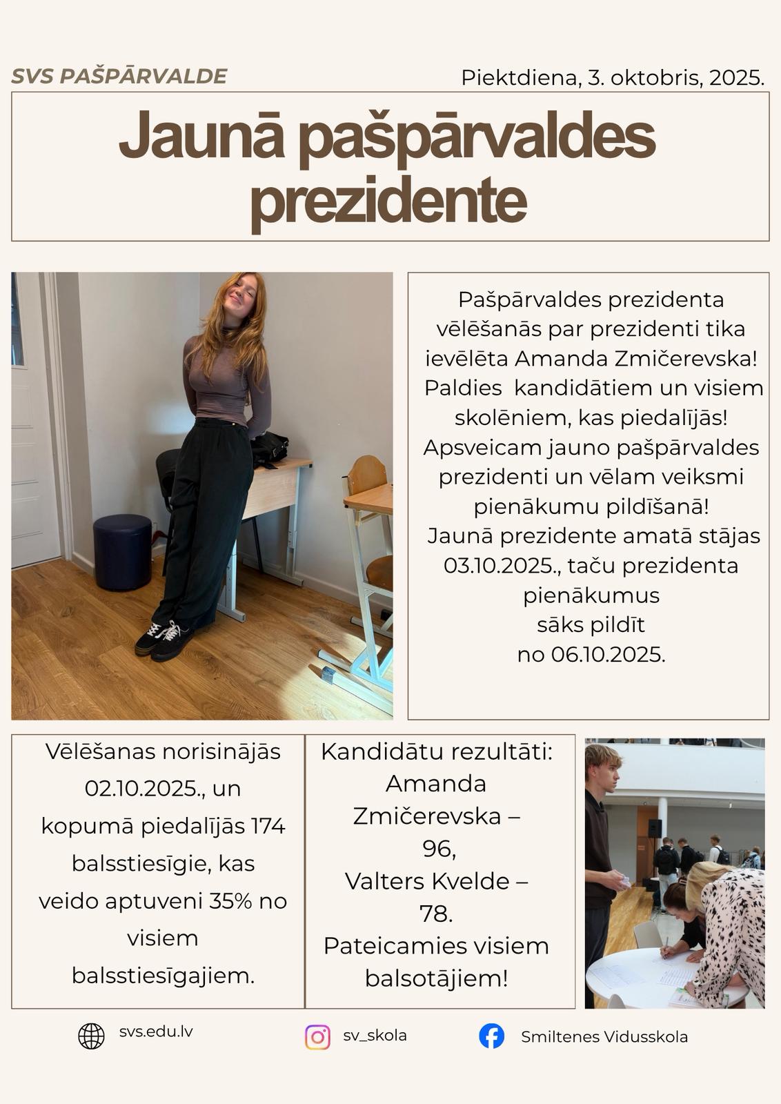 Par Smiltenes vidusskolas skolēnu pašpārvaldes prezidenti ievēlēta Amanda Zmičerevska! Apsveicam un novēlam Amandai veiksmi un visu radošo ieceru piepildījumu! Vēlēšanās piedalījās 174 balstiesīgie, n..