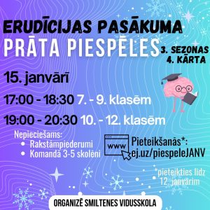 Aicinām Smiltenes un kaimiņu novadu jaunos erudītus uz “Prāta piespēļu” 3. sezonas 4. kārtu, kas notiks jau 15. janvārī! Erudīcijas pasākums Smiltenes novada 7. – 9. klašu skolēniem ..