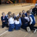 Saņēmuši pirmklasnieku medaļas, bērni kopā ar Pavasara rūķīti gāja rotaļās un mielojās ar skolas direktores Ilzes Verginas sūtītajiem svētku kliņģeriem.