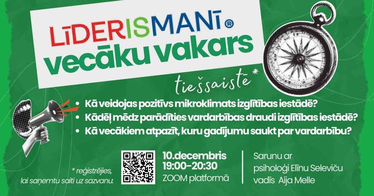 Aicinām skolēnu vecākus uz pārmaiņu procesa “Līderis manī” vecāku vakaru tiešaistē, kas notiks 2025. gada 10. decembrī no plkst. 19.00 līdz 20.30.
