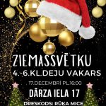 12.klases skolēni iejutās rūķu tēlos un uzdāvināja Dārza ielas 4.-6.klašu skolēniem prieka pilnu Ziemassvētku pasākumu – deju vakaru ar dažādām aktivitātēm. Dāniels, Armands, Tīna, Signe, Alise, Kitija un Sabīne kultūras un mākslas mācību priekšmeta ietvaros praktiski izmēģināja kultūras pasākuma plānošanu, organizēšanu un vadīšanu. Jaunieši vadīja spēles, aktivitātes, Ziemassvētku viktorīnu, iejutās dīdžeju, fotogrāfu lomās, ar patiesu prieku un entuziasmu iepriecināja savus skolas biedrus un nu jau jaunos draugus no Dārza ielas.