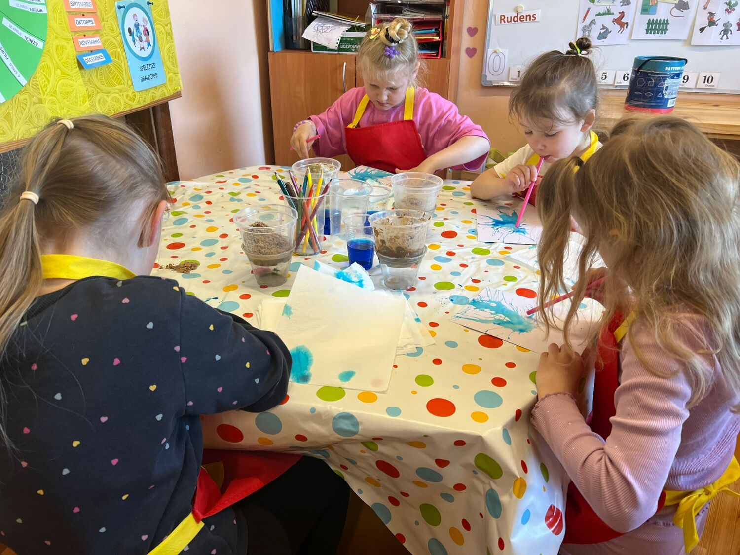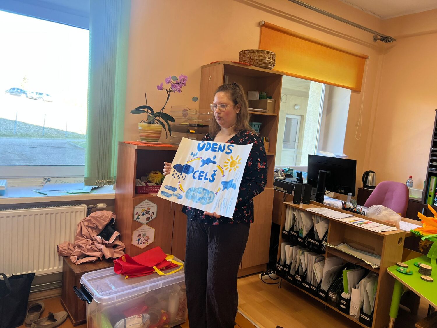 Viss sākās ar sarunu par peļķēm, tādā veidā netieši informējot bērnus, par ko būs turpmākā norise. Tāpat tika noskaidrotas arī bērnu versijas par to, kā veidojas peļķes. Sekoja praktisks eksperiments, kurā parādīta dažādu materiālu ūdens caurlaidība – kā ūdens tek caur dažādu frakciju šķembām, smilti, granti, kā izvēlētais materiāls ietekmē ūdens novadīšanu no ceļa vai taciņas lietus laikā.