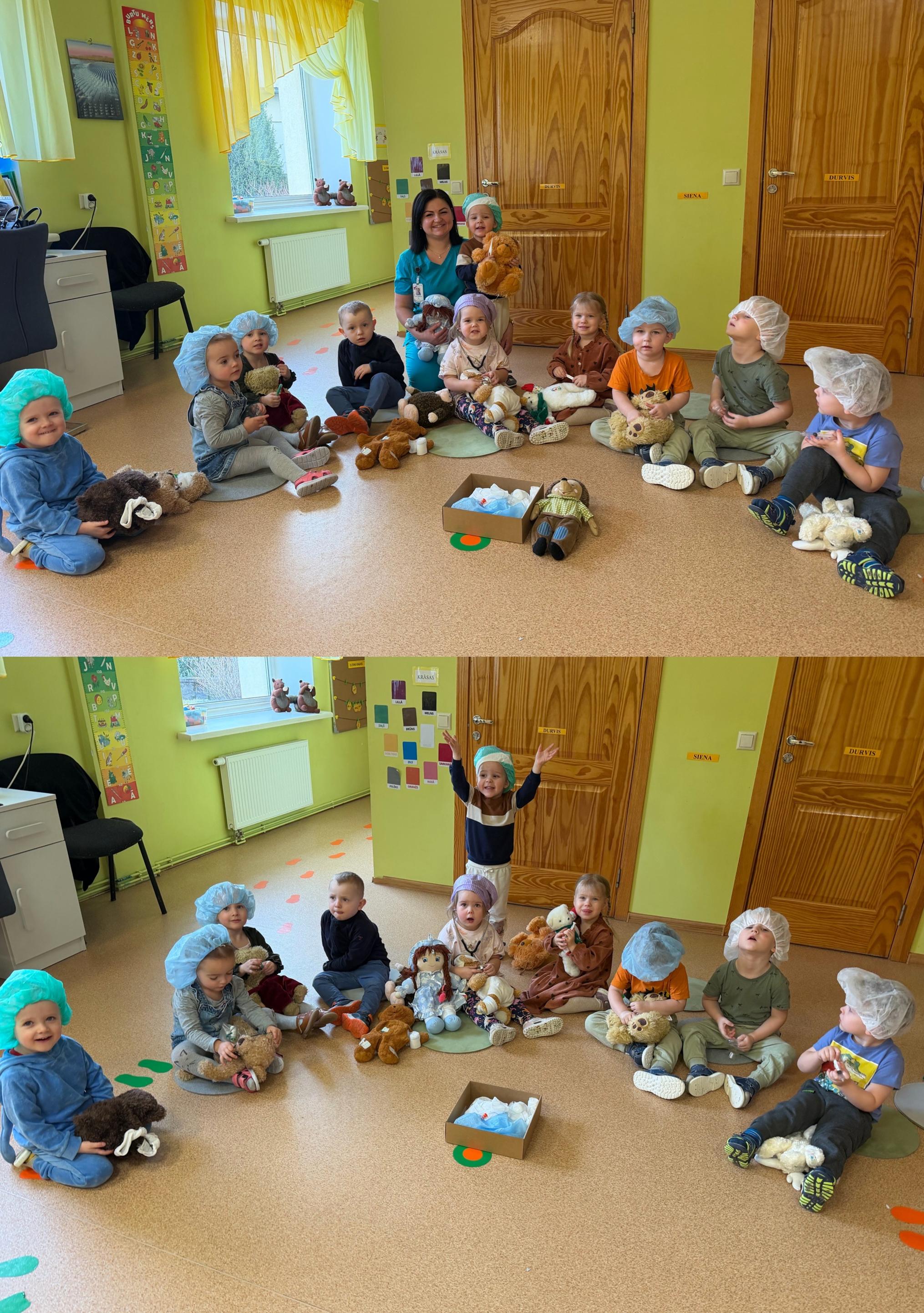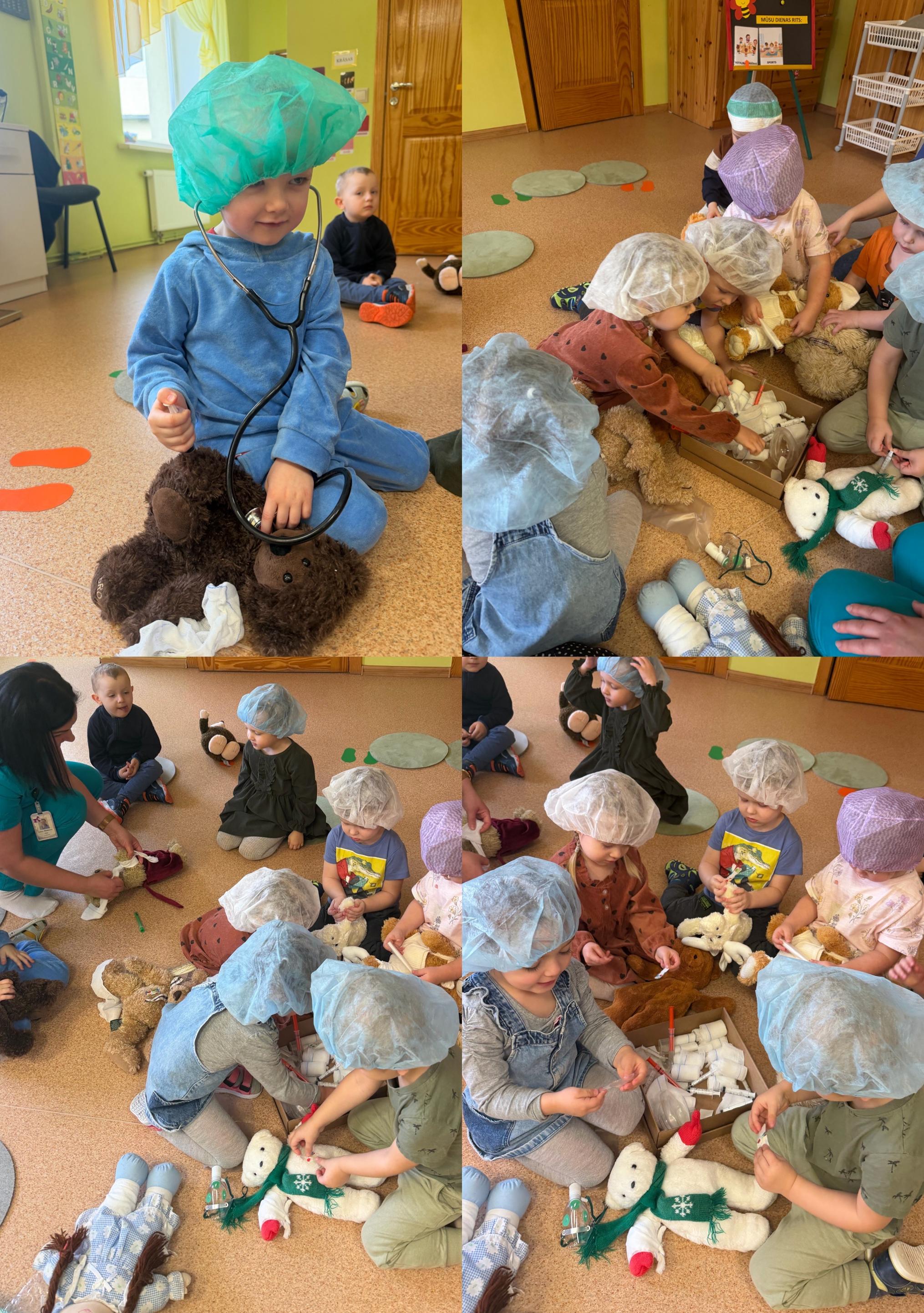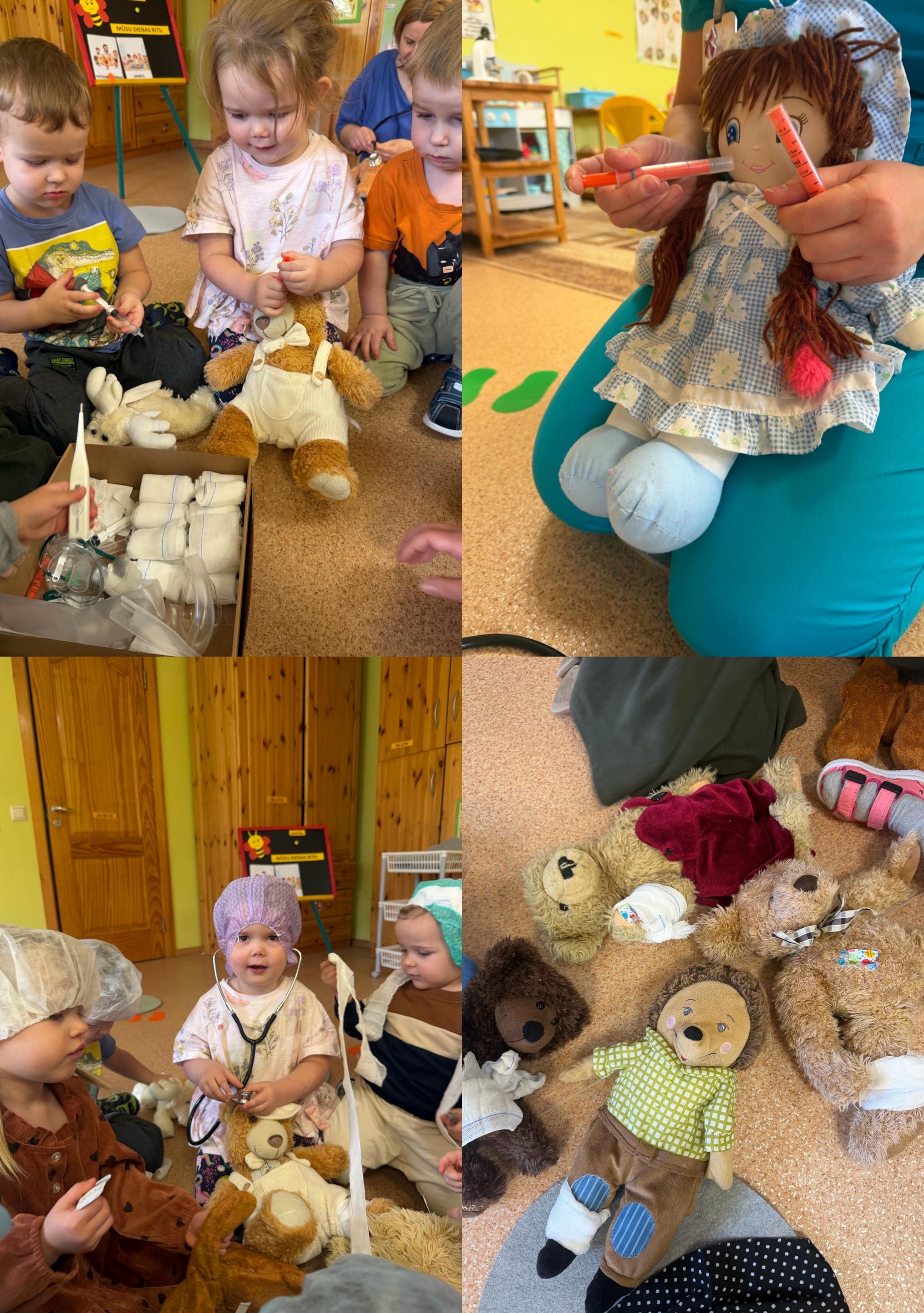 Bērni uzzināja, kam paredzēti dažādi medicīnas piederumi, kā arī izmēģināja būt par mazajiem dakterīšiem, rūpējoties par saviem rotaļu draugiem. Nodarbība bija aizraujoša, izzinoša un radīja bērnos prieku un interesi par veselību un tās nozīmi ikdienā. ☀️💊👩‍⚕️