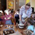 Otrdienas rīts “Bitīšu” grupā iesākās ar dziesmu – “Mēs mazie, mazie pavāri!” Ciemos bija atnākusi konditore Laila Tiltiņa, kura bērniem pastāstīja, ko dara konditors, ko viņš gatavo. Un kopā ar bērniem tika gatavota vienkāršā biezpienkūka ar cepumiem un marmelādi, bērni paši darbojās – mikserēja putukrējumu, blenderēja biezpienu, cepumus izklāja uz pamatnes, maisīja masu un vēl paspēja visu pagaršot. Pēc kūkas pagatavošanas bērni no smilšu mīklas gatavoja mazas, mazas bumbiņas – lai taptu brūnganie un gardie riekstiņi. Bērnos bija redzams liels gandarījums par paveikto.