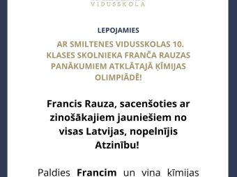 Smiltenes vidusskolas 10. klases skolnieks Francis Rauza Atklātajā ķīmijas olimpiādē, sacenšoties ar vidusskolēniem no visas Latvijas, t.sk. 12. klašu skolēniem, kuri ķīmiju apgūst augstākajā līmenī, nopelnījis Atzinību! Atklātajā ķīmijas olim..