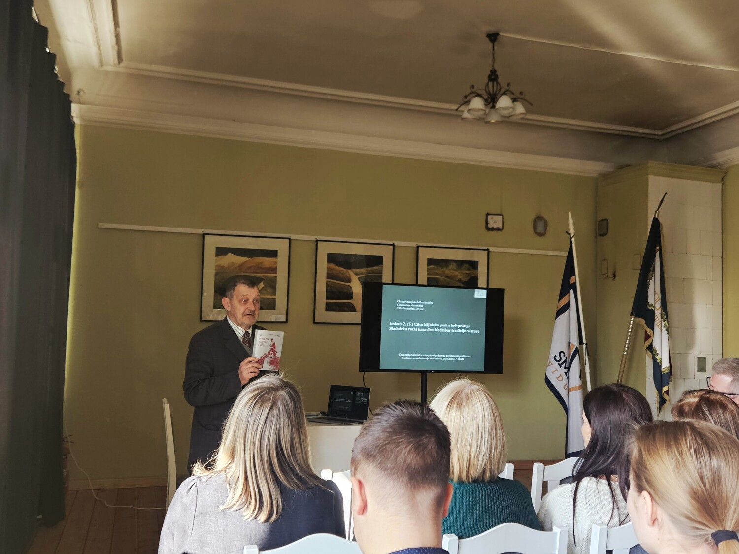 Vēstures zinātņu doktors, Cēsu vēstures un mākslas muzeja vēsturnieks, Vidzemes Augstskolas docents Tālis Pumpuriņš Cēsu pulka Brīvprātīgās skolnieku rotas piemiņas karoga glabātāju skolu jauniešiem sniedza apjomīgu ieskatu 2. (5.) Cēsu kājnieku pulka brīvprātīgo Skolnieku rotas karavīru biedrības tradīcijas vēsturē, kas cieši savijas ar Latvijas vēsturi. Klātesošajiem bija iespēja redzēt vairākas unikālas, ar minētā pulka un tā piemiņas karoga tradīcijas glabāšanu saistītas fotogrāfijas.