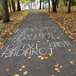 Kad kokus sāk iekrāsot rudens, dienas nepielūdzami kļūst īsākas un mājokļos iezogas nemīlīgs drēgnums, ir laiks, lai, sildot rokas pie siltas tējas tases, ieklausītos savā sirdī. Tieši tādā noskaņā Smiltenes vidusskolas 10.-11. klašu skolēni ir aizvadījuši mācību gada pirmo ceturksni. Septembris ir dzejas mēnesis, un tāpēc vizuālās mākslas stundās veltījām laiku, lai ieklausītos sevī un savos klasesbiedros, kā arī domājām par to, kā uzrunāt pilsētas iedzīvotājus, kuri, baudot rudens krāšņumu, savām pastaigām izvēlas Veco parku un Tepera ezera promenādi. Domas cita aiz citas gūlās uz pelēkā asfalta, un koki tās steidza papildināt ar dzelteni sārtām atzīmēm.